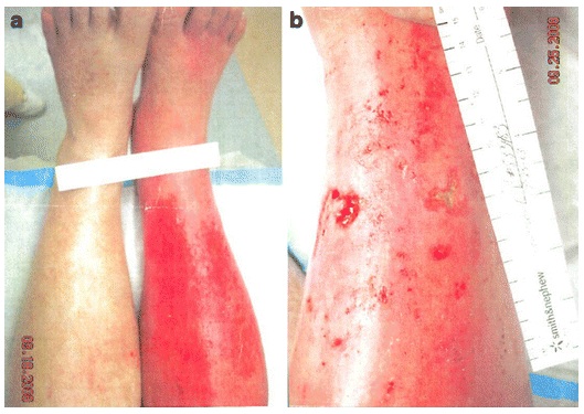 Fig. 1—Advanced CRPS symptoms in Case 1, 4.5 years after onset of the disorder. a. Allodynia and pronounced vasomotor dysfunction are present in the lower right extremity (photo taken 9/18/2008). b. One week later, the leg has developed numerous ulcerations