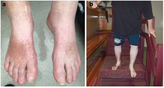 Fig. 2—Case 1. Certain symptoms are attenuated following treatment with low-dose naltrexone (LDN) in a long-standing case of CRPS (6 years after onset). a. Allodynia is greatly reduced in both legs after LDN. However, bilateral trophic changes remain in the lower extremities. Slight swelling is present in the distal portion of the right foot. Within 2 months of treatment with LDN, the patient was able to bear full body weight, and walk without assistance. Before LDN, the patient utilized a cane for 6 years. b. One year after LDN treatment, the patient still has persistent long-term trophic changes in the skin of both lower extremities (taken 1/16/2013)